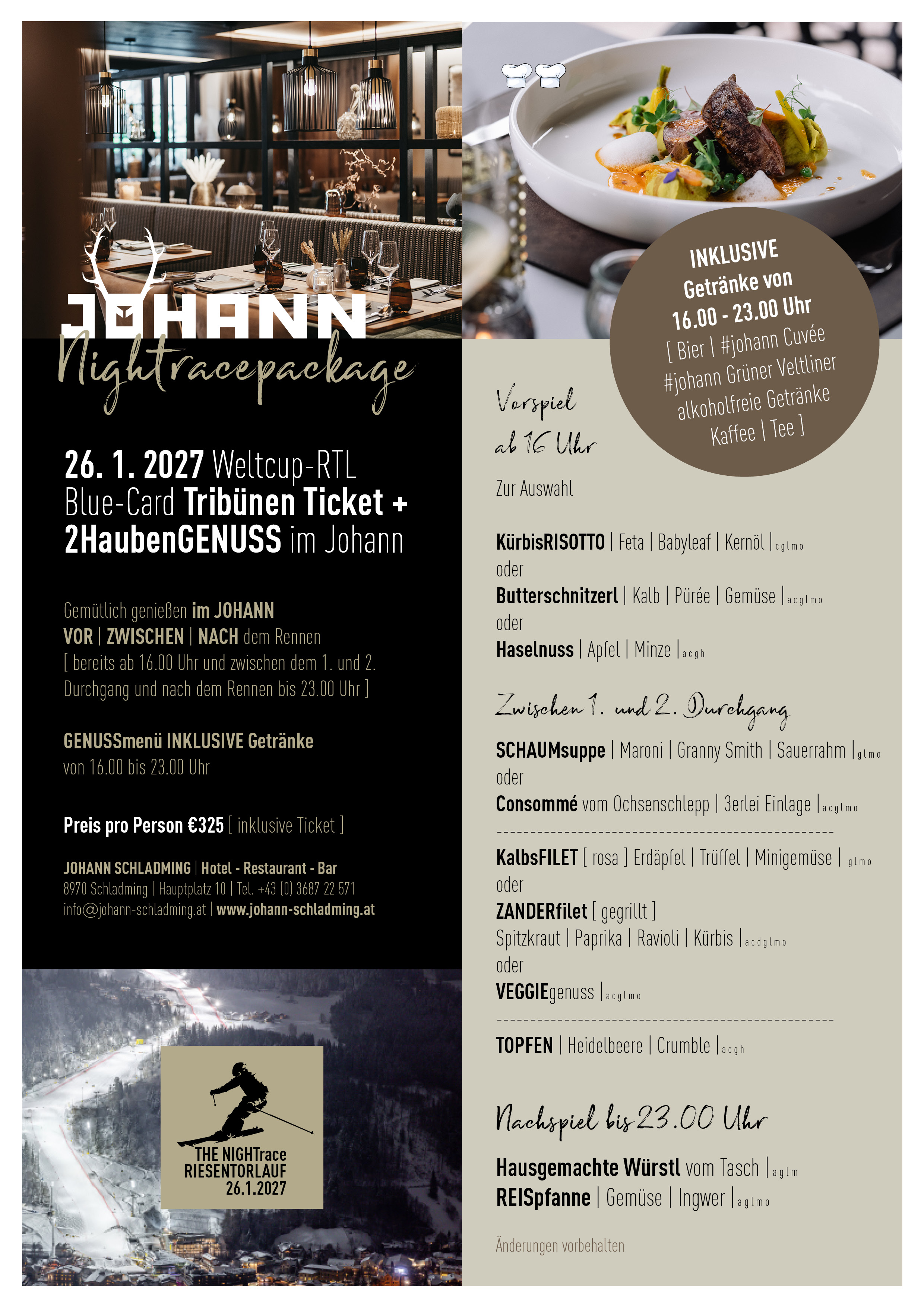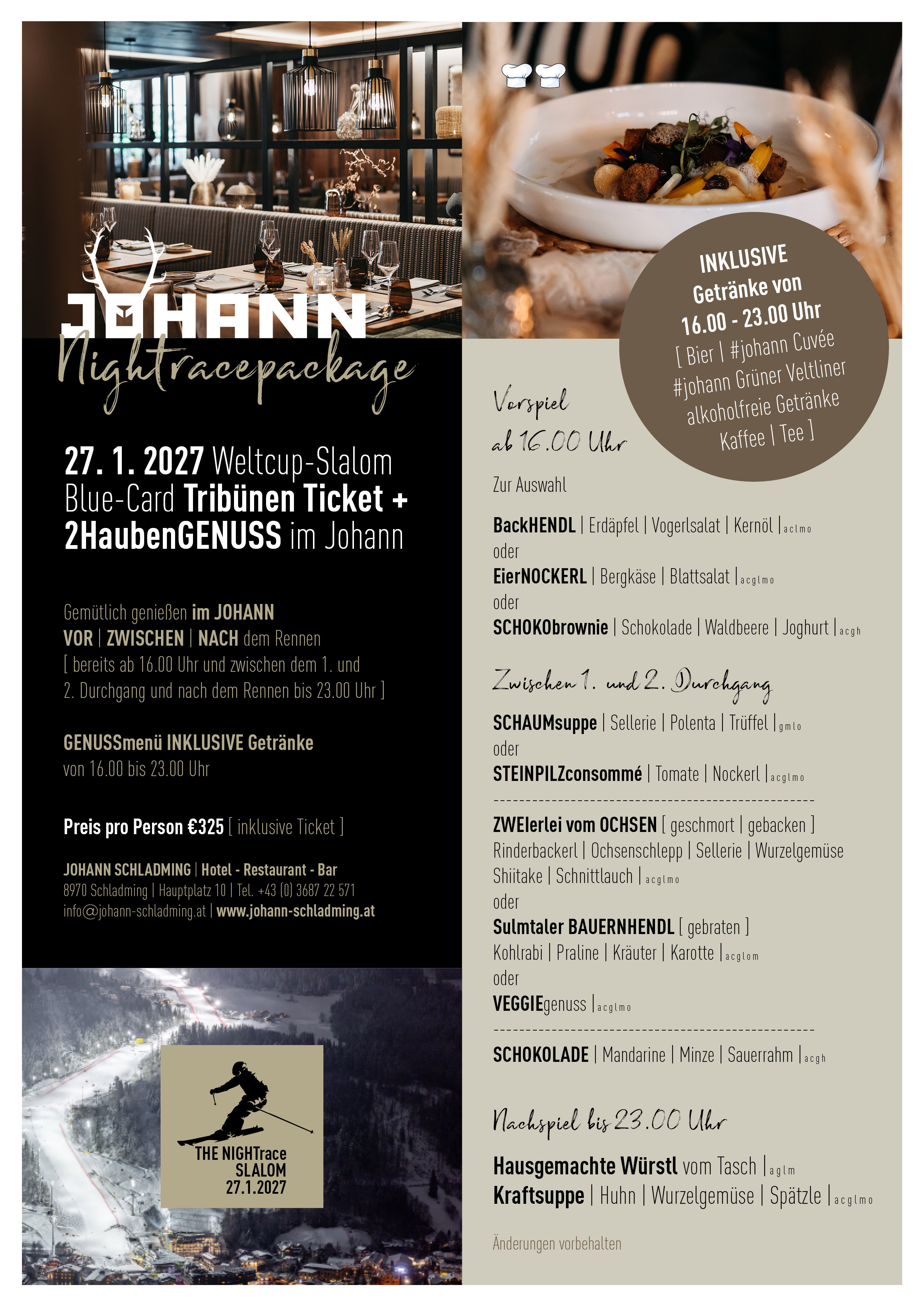 - Gemütlich genießen im JOHANN VOR | ZWISCHEN | NACH dem Rennen [ bereits ab 16.00 Uhr und zwischen dem 1. und 2. Durchgang und nach dem Rennen bis 23.00 Uhr ]